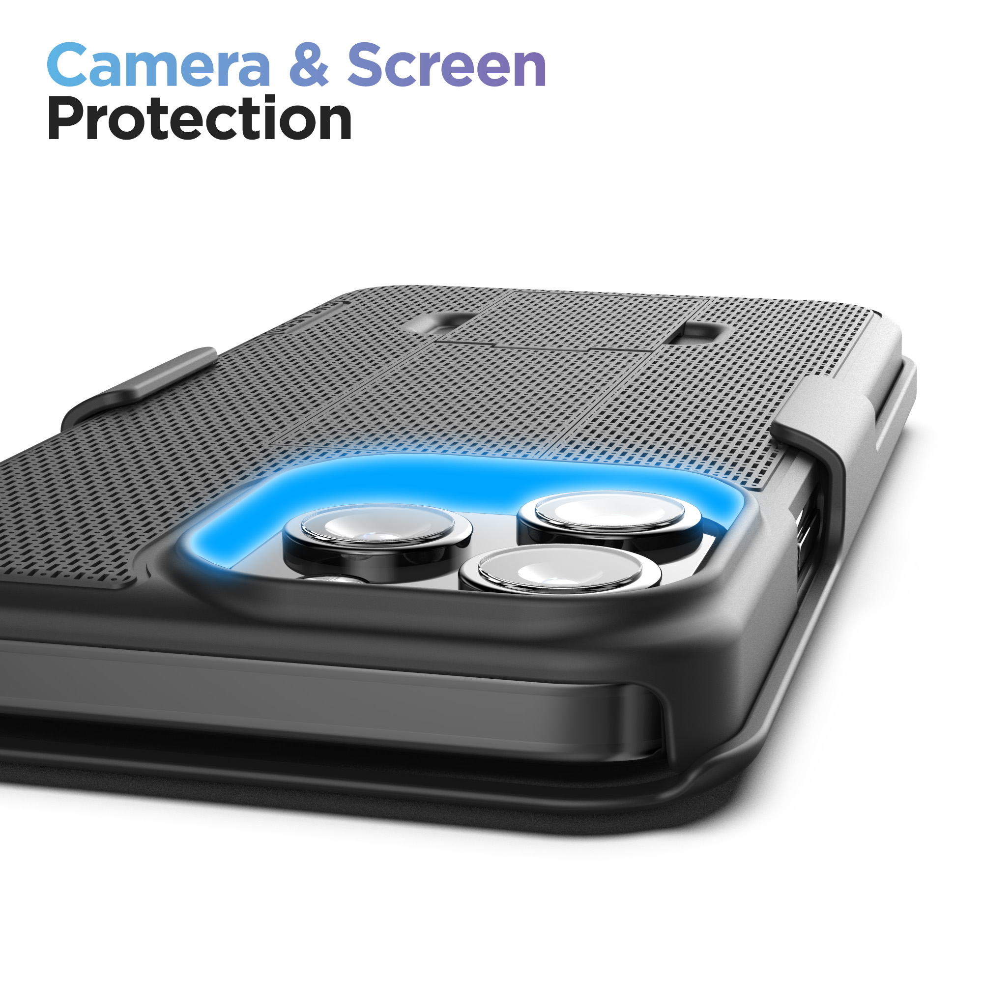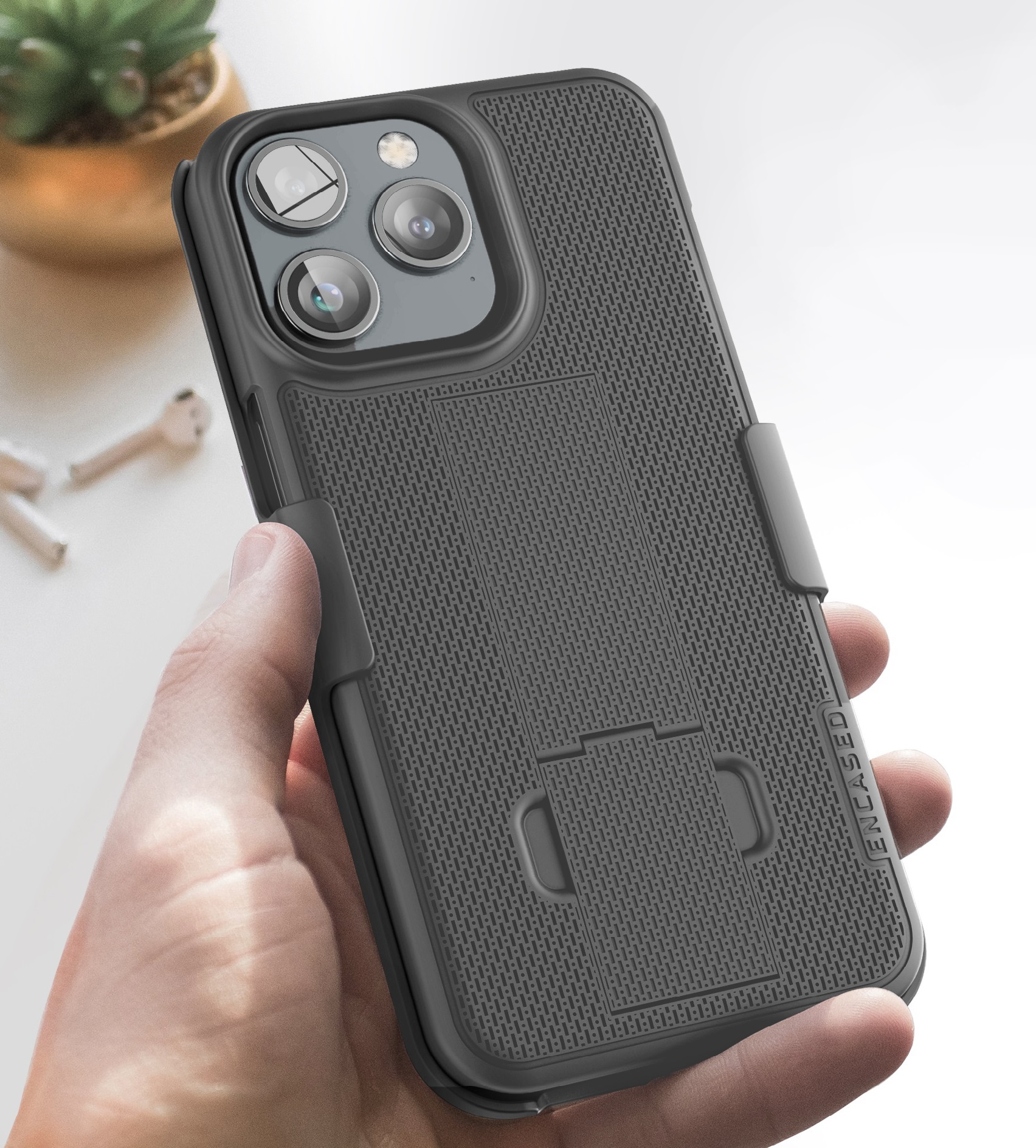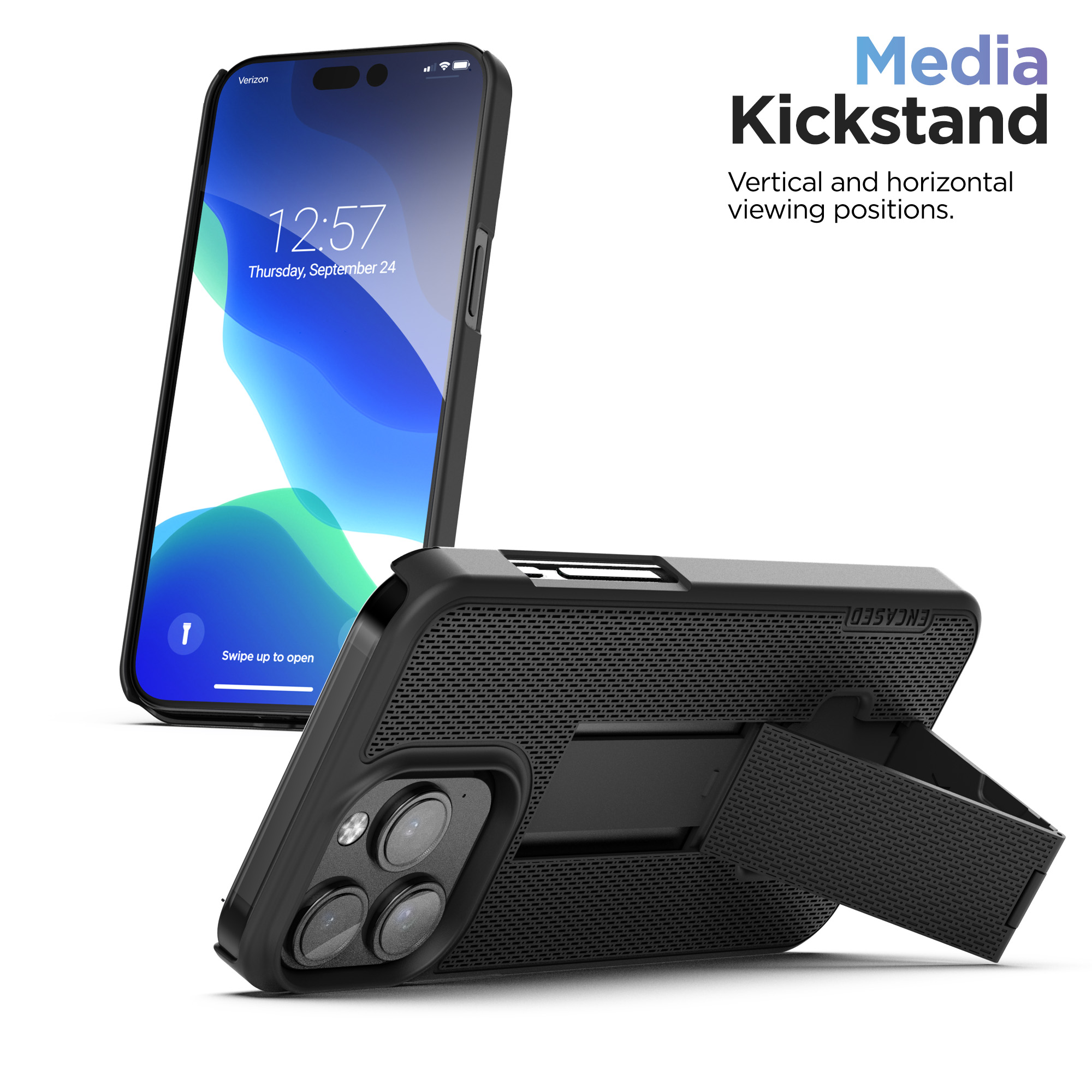 The ultra-slim DuraClip belt clip case keeps your phone at your side, ensuring that your phone remains both secure and easily accessible. Crafted with precision, the slim case features a rubberized texture for a comfortable grip on your device. Seamless wireless charging compatibility and a built-in media kickstand add extra convenience. Plus, the raised lip design ensures your screen stays protected from accidental bumps.