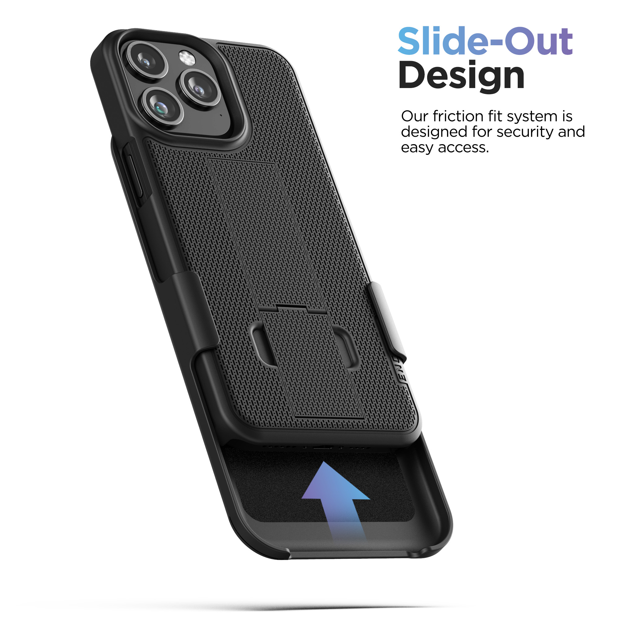 Every DuraClip set comes complete with a secure-fit holster made with solid-core polycarbonate construction and a felt lining to provide optimal safeguarding for your phone’s screen. The belt clip rotates for vertical or horizontal use to suit user preference. Slide-in holster design holds your phone securely in place while keeping it easily accessible when you need it.